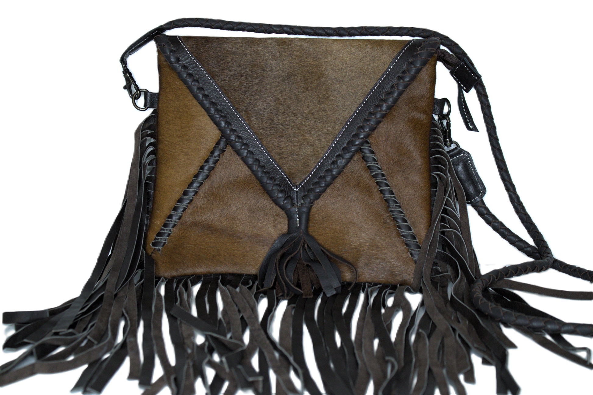 Introducing our stylish crossbody purse, crafted with a combination of braided leather and cowhide. This exquisite accessory features a captivating blend of brown and black tones, creating a versatile and timeless design. Adorned with fringes, this purse adds a touch of bohemian flair to any outfit. With its convenient crossbody strap, it offers both functionality and fashion-forward appeal. Elevate your style with this elegant and eye-catching brown and black purse with fringes.