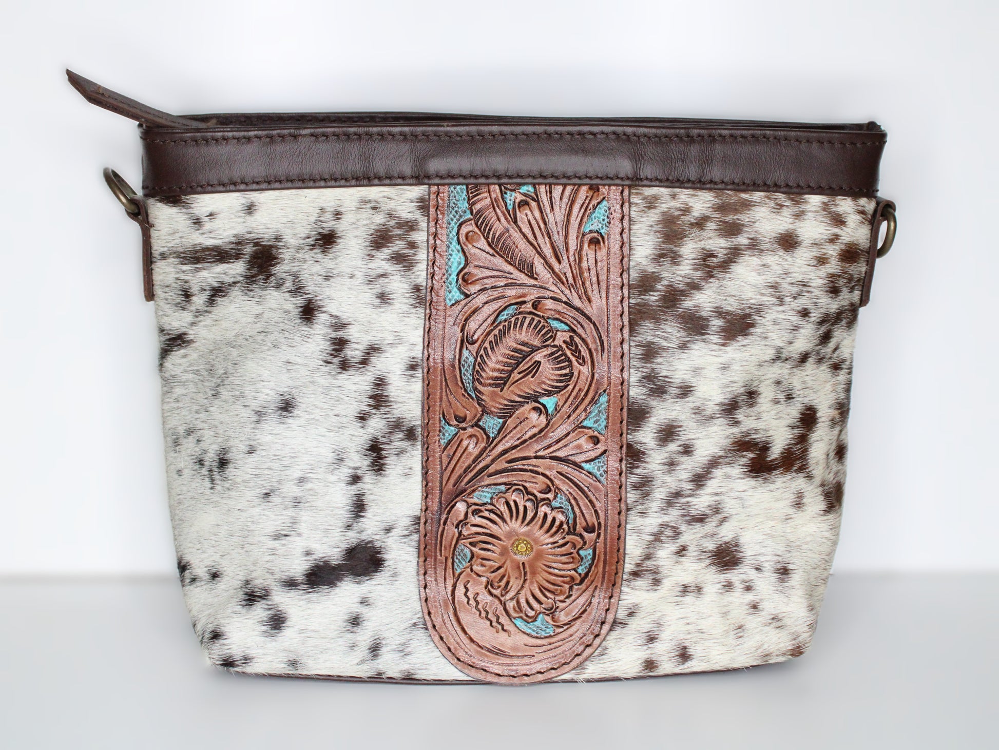 Introducing our exquisite cowhide crossbody bag with stunning turquoise accents. Crafted with the finest materials, this small crossbody bag features a unique combination of cowhide and tooled leather, creating a stylish and durable accessory. The eye-catching turquoise accents add a touch of elegance and sophistication to this versatile bag, making it perfect for any occasion. With its compact size and adjustable strap, it offers both functionality and fashion-forward design. Upgrade your accessory collection with this must-have cowhide crossbody bag.