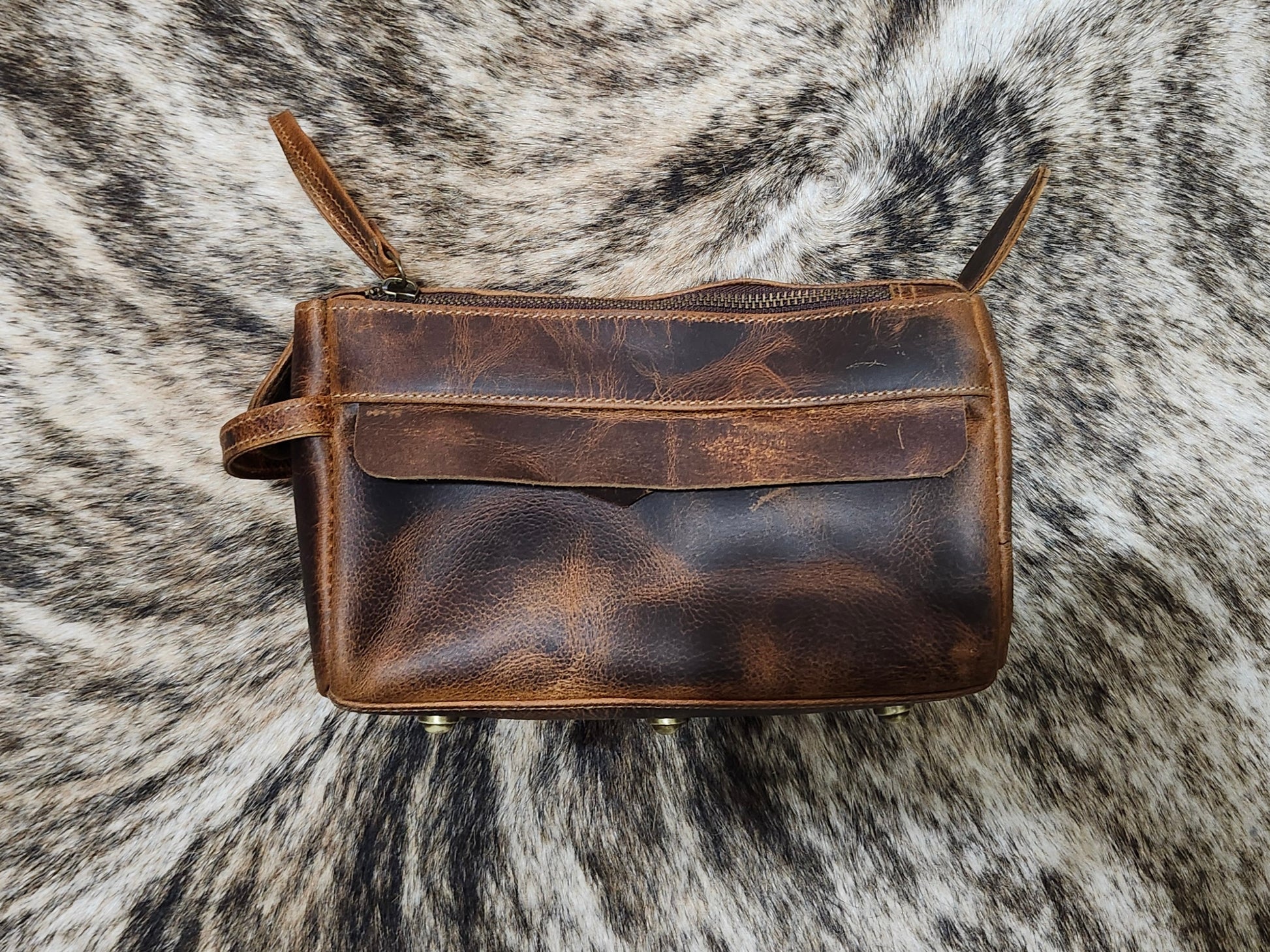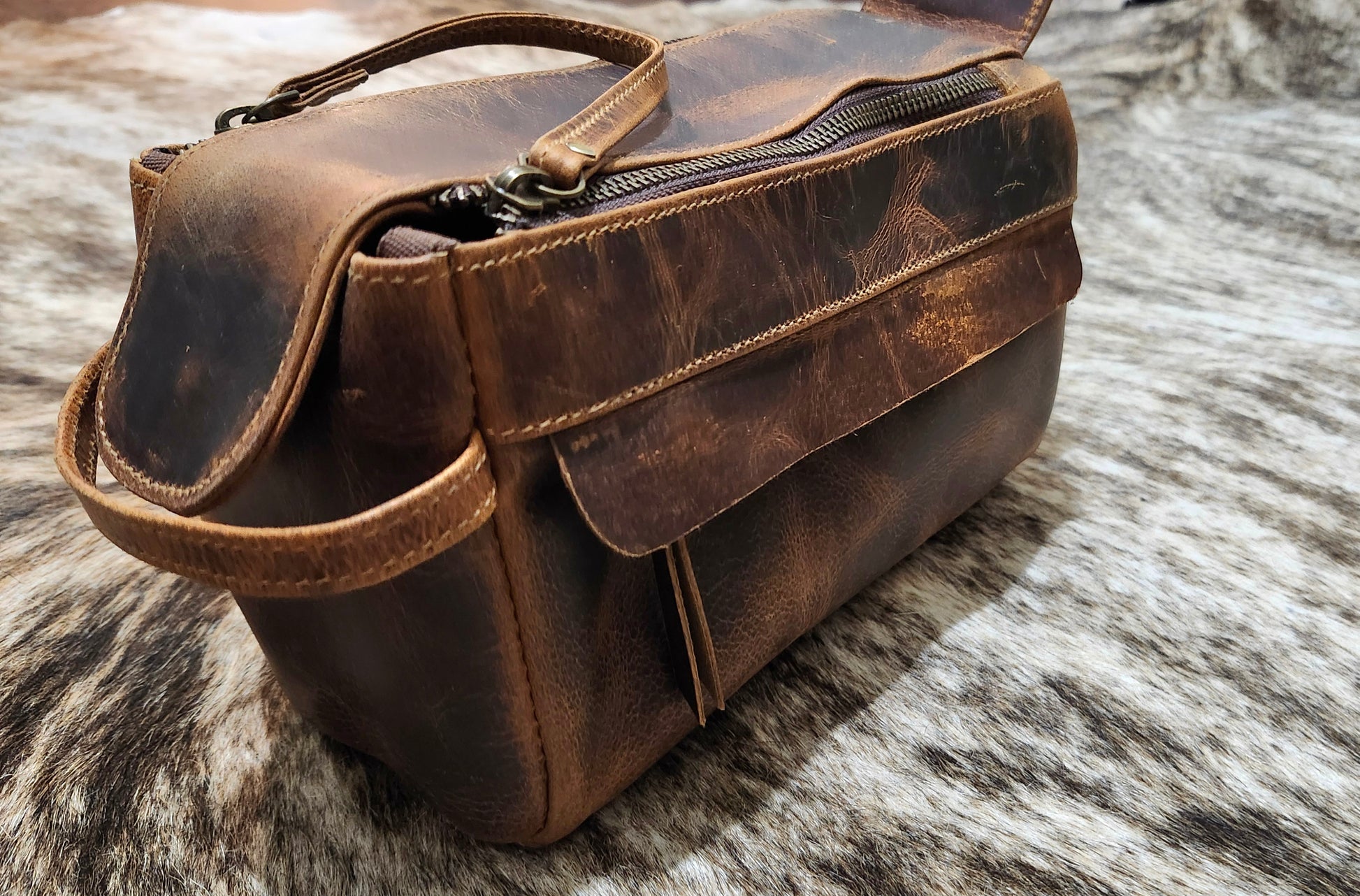 This leather toiletry bag has room for all of the necessary bathroom items you may need. With a double zipper, a front magnet closure and a zipper on the side.
